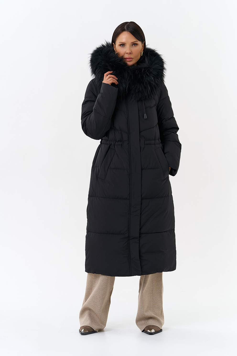 Крой воротника - капюшон, отделка чернобурка